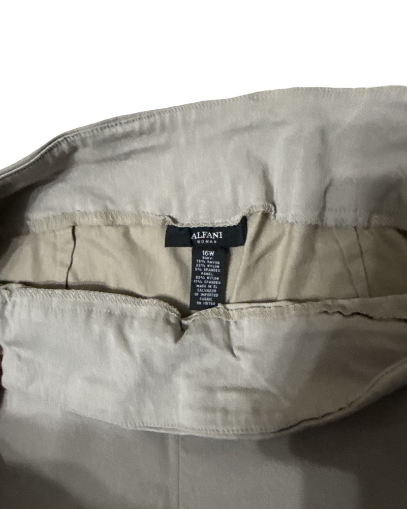 Up for your consideration is a pair of crop beige pants in a size 16W . Measurements: Inseam 22.5", Outseam 32", Waist 18" across, Rise 13.5" from hem to crotch seam They are in excellent condition. I am downsizing, which means I will have lots more clothing I am listing over the next couple weeks. Please check back in or favorite my store for updates when they post. The material content is 75% Polyester, 22% 3% Spandex