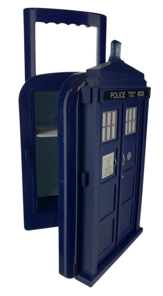 Up for your consideration is a Doctor Who Tardis Police Call Box. It is in nice gently used condition. Retired and rather difficult to find. It will both cool and warm interior contents. It is portable and has a nice handle for easy transport. Front door latches nicely and can be powered by a 12V car adaptor (not included). It does come with an AC Power cord. It is in nice gently used condition, tested and working. Fully functionable cooling and warming with sound option available which plays the theme song and lights up. Please note, there may be light scuffing or scratching to the surface from storage and age.