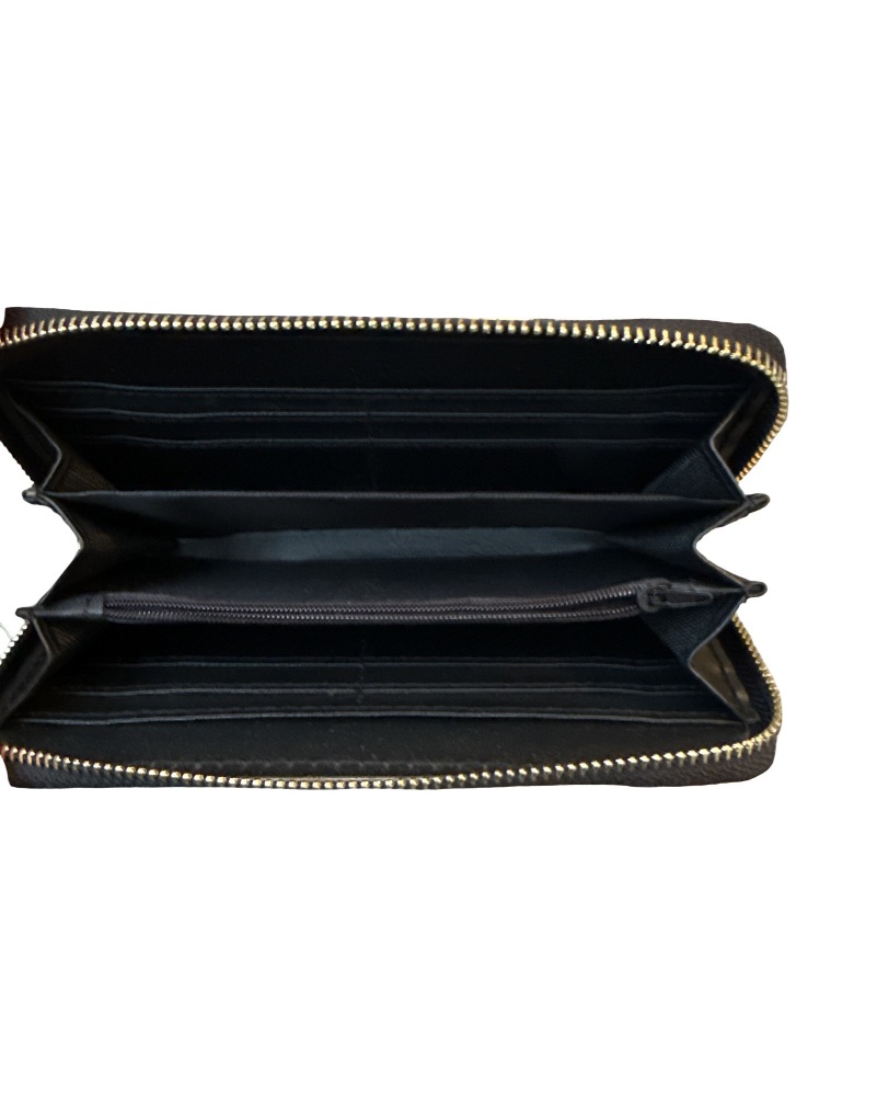 Material: Quality patent vinyl Measurements: Measures Approx: 7.5" (L) x 1" (W) x 3.75" (H) Weight (lbs): 0.5 Compartments: 12 Zipper Pockets: 1 -Quality vinyl material and uniquely designed -Gold star studs -3 Bill Slots with 2 Dividers -8 card slots and 1 zippered pocket inside